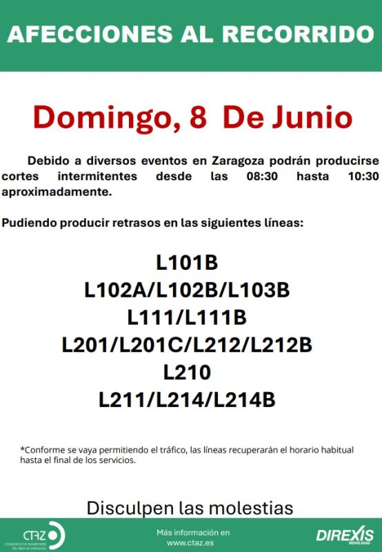 [LINEAS CTAZ] AFECCIONES DOMINGO 8 DE JUNIO POR DISTINTOS EVENTOS EN ZARAGOZA